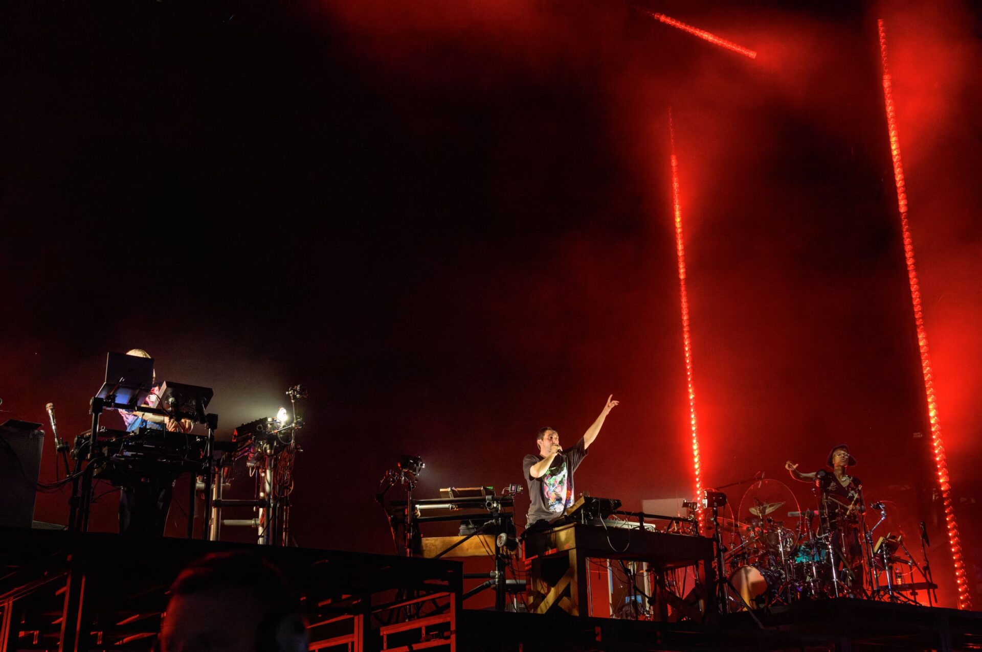 お次はいよいよ初日ヘッドライナーFRED AGAIN..の登場である……かと思いきやグリーンステージで予期せぬ機材トラブルが発生した模様。出演が1時間以上遅れるというアナウンスがフジロックのオフィシャルから迅速にオーディエンスに届けられる。そして時を同じくしてFRED AGAIN..本人からもSNSで謝罪と同時に「本来であれば時間被りであったEZRA COLLECTIVEのライブが観れるぜ」という粋なアナウンスもあり、遅延によるマイナスな感情は場内にはほぼ皆無。さすがのフジのオペレーション。並びにキャリア初期より今に至るまでSNSを巧みに扱ってきたFRED AGAIN..である。EZRA COLLECTIVEはヘブンにてステージを始めている時間だ。めちゃくちゃに行きたかったのだが体力面を考慮し泣く泣く断念。しばし長めの休憩をオアシスにて確保することができた。