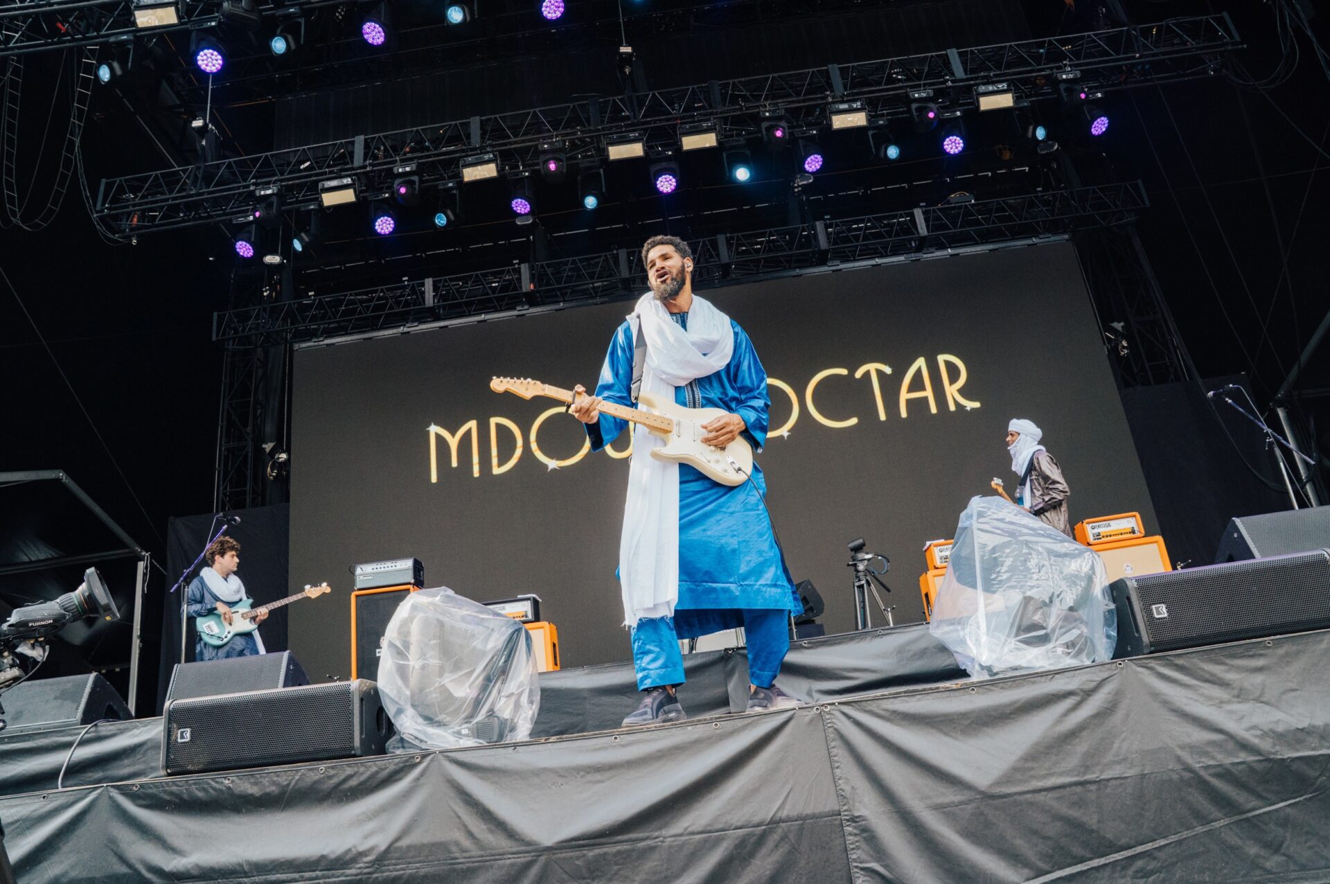 なんとか開演数分前に滑り込めたホワイトステージ前方。初日大本命の登場である。結論から言うと、MDOU MOCTARのライブはサイコーであった。近年ほぼお約束とすらなっているように思うフジロックのサイケ枠であるのだが、今年白羽の矢が立ったのがアフリカの砂漠地帯、ニジェール出身の彼ら。過去にはKhruangbinやALTIN GÜN、そして昨年はレッドマーキーが超満員となったGLASS BEAMSなど毎年大きな期待をもって迎えられるこの枠なのであるが、先述のバンドたちと決定的に違うのが楽曲のスピード感。単純にBPMがめちゃくちゃ速く、ライブではさらにドラマーSouleymane Ibrahimが走りまくるのだ。そんな自身のルーツであるトゥアレグ族の民族音楽に根差した独特のドラムパターンの上で、ひたすらに回転するリフとボーカルとギターソロが入り乱れる、といった音楽性。サイケと言うよりはエスニックな人力トランスといった趣きである。