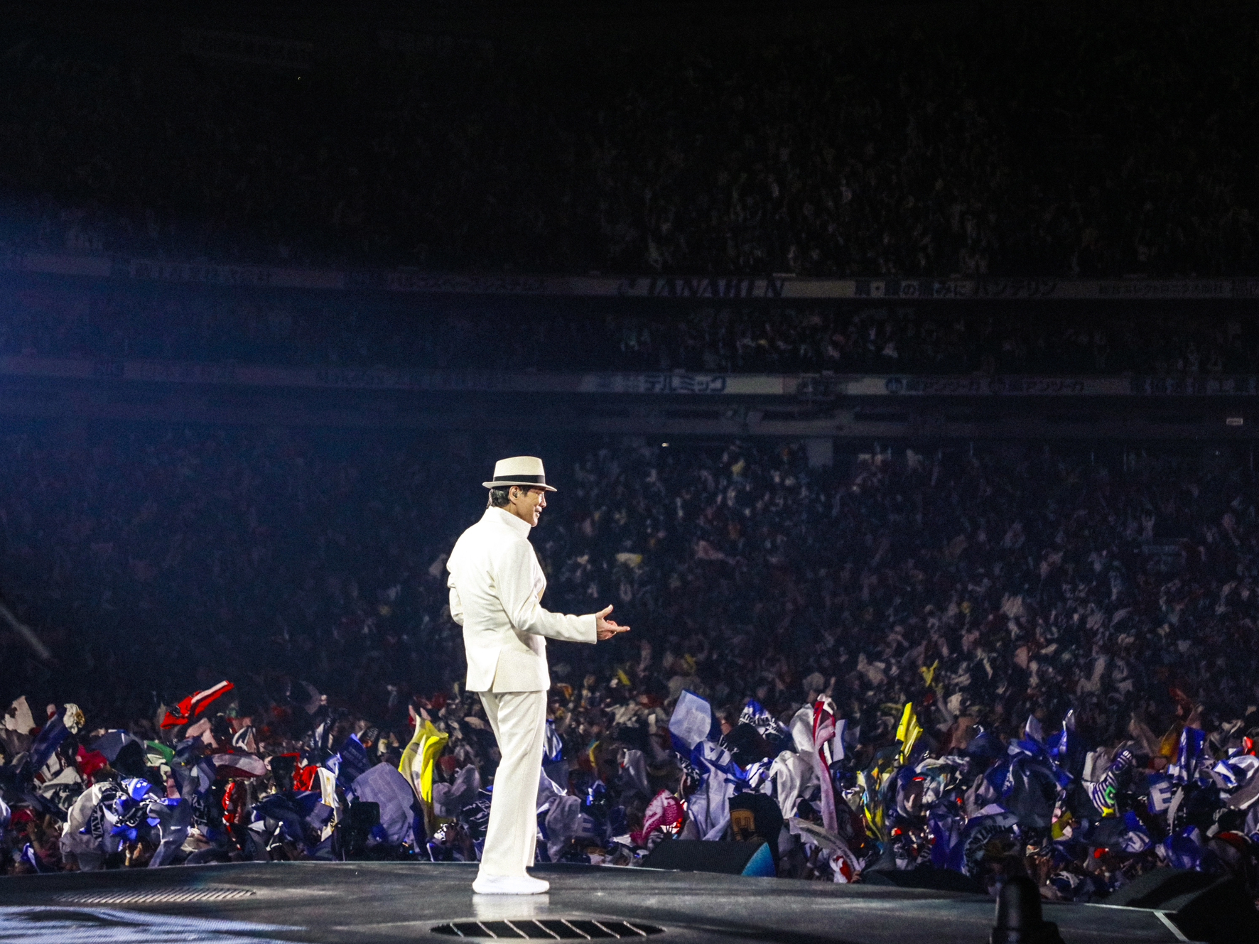 ついに永ちゃんファンの装いに最もその比率が高かった白のセットアップ姿で本人がステージに再臨。ここから矢沢は3曲続けてのキラーチューンというゴールドラッシュで畳みかける。オフィシャルの文言からもある通りアンコールでは永ちゃんコールもシンガロングも解禁となるので、場内総出のお祭り騒ぎである。「鎖を引きちぎれ」は一瞬で再びドームの熱を最高潮まで引き上げ、ここでとうとう矢沢がパナマ帽を被った……ということで押しも押されぬ代表曲「止まらないHa~Ha」だ。永ちゃんコールと並ぶ矢沢ライブでの名物“タオル投げ”が客席を色とりどりに染め上げる光景は、どんな照明よりもどんな演出よりも美しい。ラストはこちらもリリース当時から現在に至るまでの49年間矢沢のライブのラストを飾ることが多かったであろう「トラベリン・バス」。歌詞の通りロックン・ロールに憧れ生まれた町を出た矢沢がどこまでもビッグなスーパースターになっても初心を忘れぬよう、そしていつまでもロックに憧れ続け、きつい旅だとわかっているけどそれでもやめられない矢沢と永ちゃんファンの旅路がこれからも賑やかであるよう、そんな“誓いの歌”で50周年以降さらなる前人未到を突き進むことを約束してくれたように思う。