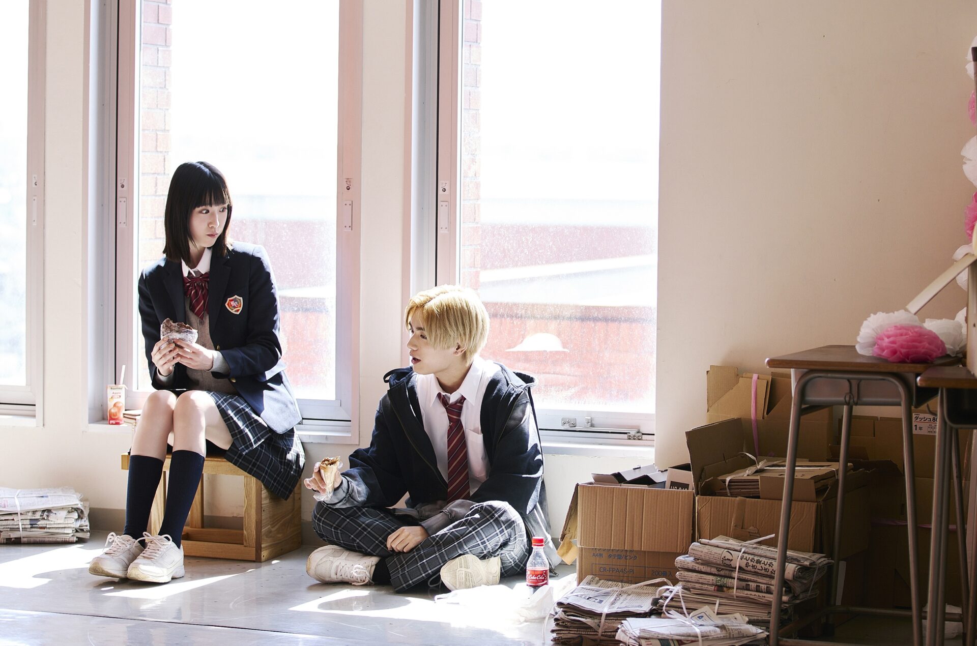 今回解禁されたのは、山口くんと皐の二人きりのシーンの場面写真。クラス中から近寄りづらいと思われている山口くだが、その素顔は照れ屋でやさしいピュアボーイ。解禁された場面写真は学校の踊り場で二人きりでパンを頬張る昼休みのシーンや、うたた寝している山口くんを皐が珍しそうに覗き込む、恋の始まりを予感させる初々しい一幕など、皐の前だけで見せる山口くんの無防備で特別な表情が切り取られている。さらに私服姿で甘酸っぱいデートを思わせる雰囲気の中、転びそうになった皐を助けようとした山口くんと顔が近づく超至近距離の2ショットもあり、まさに皐目線で山口くんを”ひとりじめ”したくなってしまうような全3点となっている。